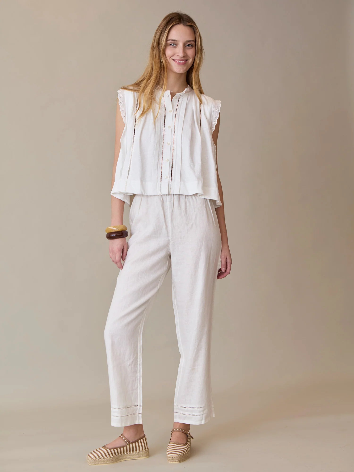 • Woven fagoting trim details at front and back body